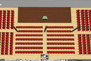The image on side represents a typical warehouse church layout: a large open-span structure allowing flexible seating arrangements, defined stage positioning, clear circulation paths, and controlled entry points. The advantage of warehouse buildings lies in their structural openness, enabling expansive sanctuaries without excessive column interference.