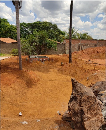- Excavation: The excavation should have a 45° angle on the edges, ensuring that the soil around the pond doesn’t slide. The recommended maximum depth is 0.60 meters, providing stability to the land.